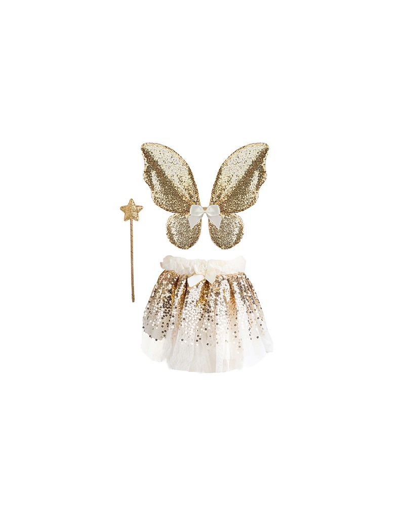 ¡El hada más mágica del país! ¡Con nuestro conjunto de lentejuelas doradas Gracious de 3 piezas vas a estar brillante! La falda tutú color crema tiene la cintura con volantes y lentejuelas doradas. El set incluye también una varita de estrella y alas cubiertas de lentejuelas doradas a juego y forradas con un hermoso satén de color crema. ¡Este es un diseño elegante, dulce y encantador.