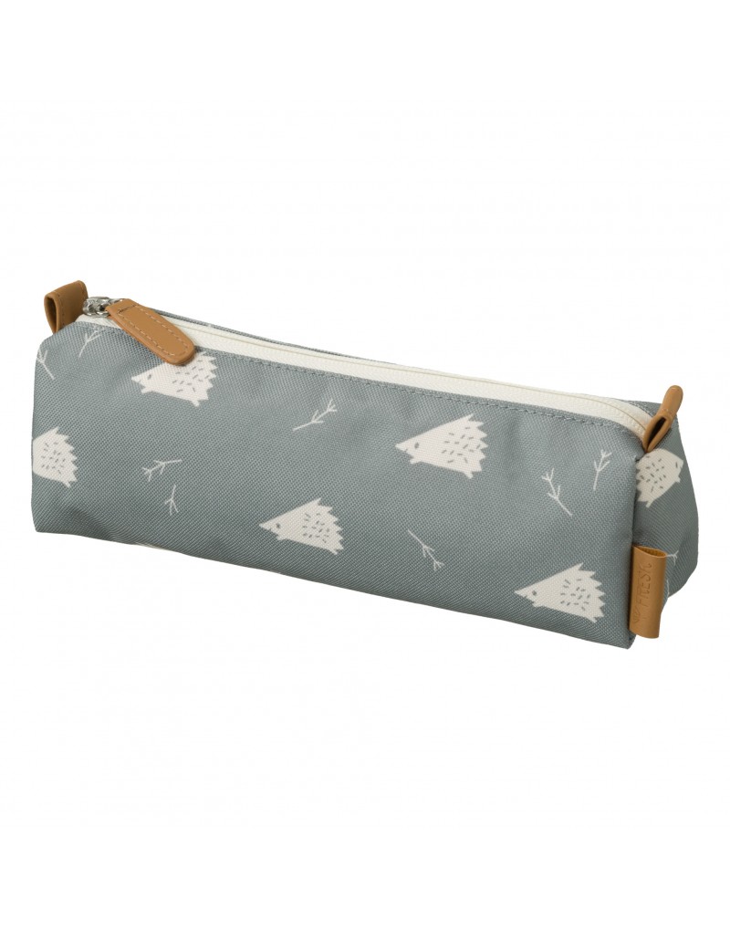 Estuche de color gris estampado con erizos. Cierre de cremallera.