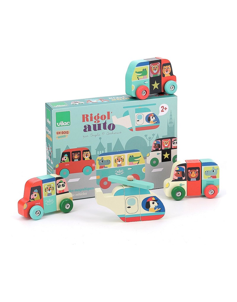 Un juego con diferentes vehículos magnéticos de madera con múltiples asociaciones con dos, tres o cuatro partes de un coche, camión o helicóptero.