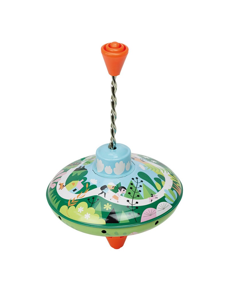 Una peonza de metal que gira cuando empujas la palanca. Luego comienza a girar, llevando a los animales y personajes a un baile loco. Permanece en equilibrio y se detiene después de un rato. Este juguete atemporal es capaz de entretener a grandes y pequeños.