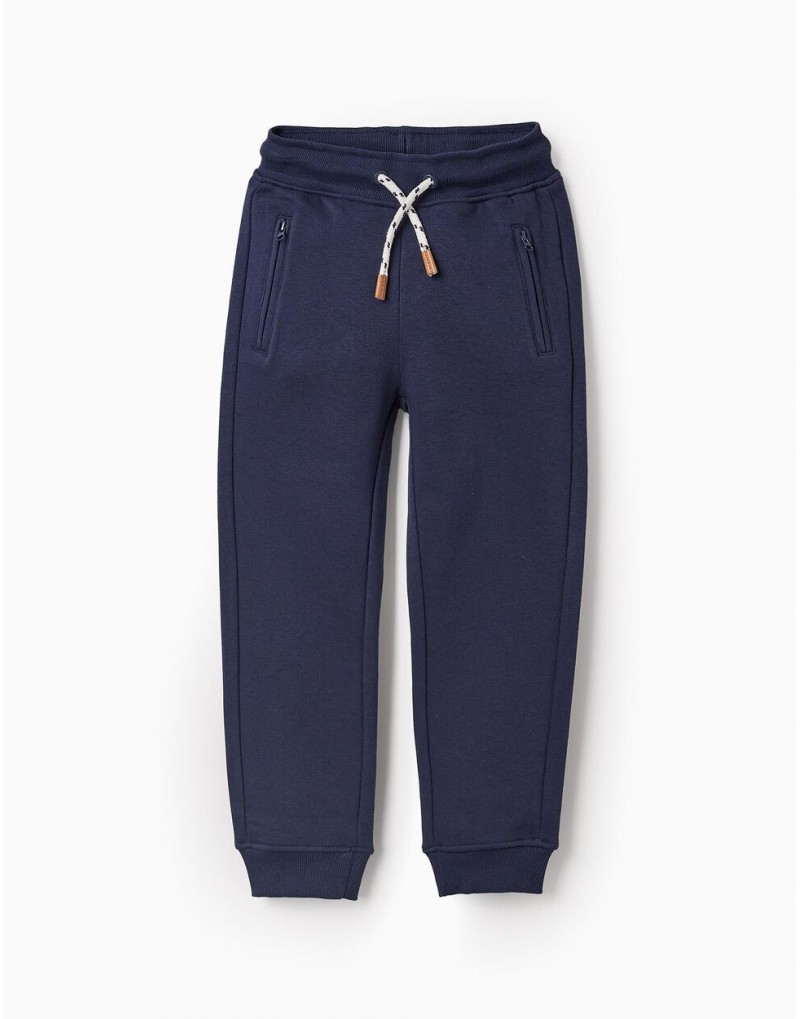 Pantalón jogger azul marino para niño, con interior perchado para mayor confort térmico. Cintura elástica con cordón, ajustable en el interior con elásticos y botones. Bolsillos laterales con cremallera. Bolsillo trasero abierto. Bajos acanalados para un ajuste perfecto. Un par de pantalones cómodos y fáciles de combinar, ideales para el día a día.