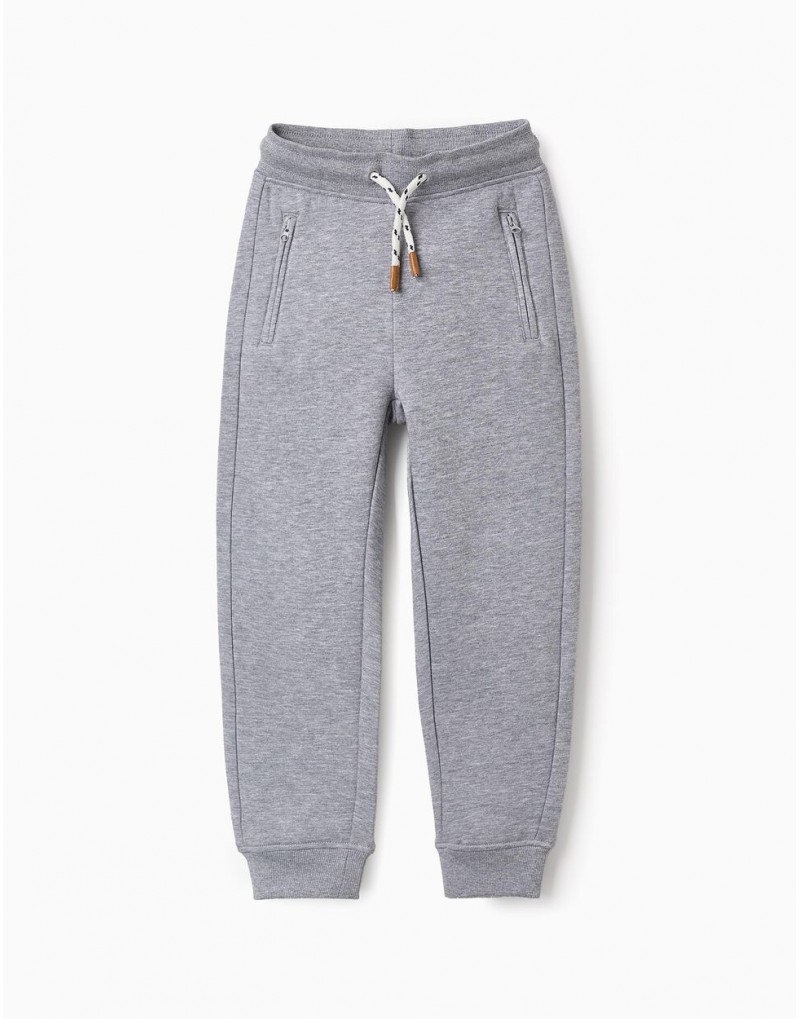 Pantalón jogger gris para niño, con interior perchado para mayor confort térmico. Cintura elástica con cordón, ajustable en el interior con elásticos y botones. Bolsillos laterales con cremallera. Bolsillo trasero abierto. Bajos acanalados para un ajuste perfecto. Un par de pantalones cómodos y fáciles de combinar, ideales para el día a día.