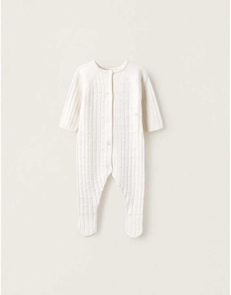 Pelele de punto blanco para recién nacido, con rayas incorporadas y lunares en relieve. Botones en la parte delantera y automáticos en la entrepierna para vestir fácilmente. Un pelele original, suave y acogedor, ideal tanto para looks caseros como para salidas.