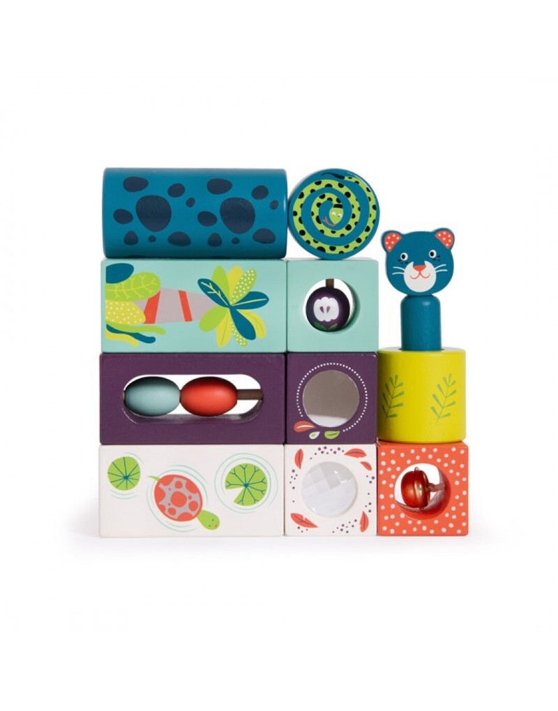 Un clásico de la primera infancia, unos cubos inspirados en la jungla. Cada uno contiene un elemento sensorial distinto para el entretenimiento y desarrollo de tu bebé.