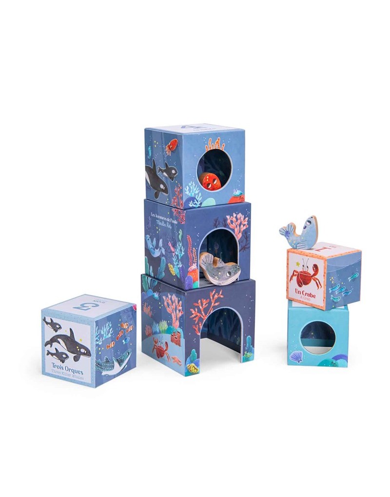 6 Cubos apilables con temática del mar, con diferentes funciones además de colocarlos en torre: contar los animales identificar los números y jugar con las 3 piezas de madera de pulpo, foca y ballena.
