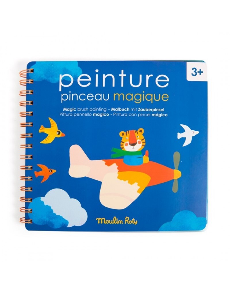 Un libro de 10 ilustraciones con un pincel con reserva de agua que al pintar en la zona en blanco aparece el color para luego desaparecer en unos minutos.