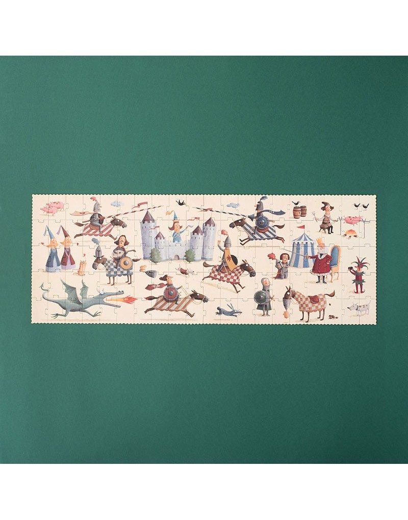 Con este puzzle de 100 piezas cabalgaremos por la Edad Media, un mundo de caballeros, dragones y princesas con mucho sentido del humor.