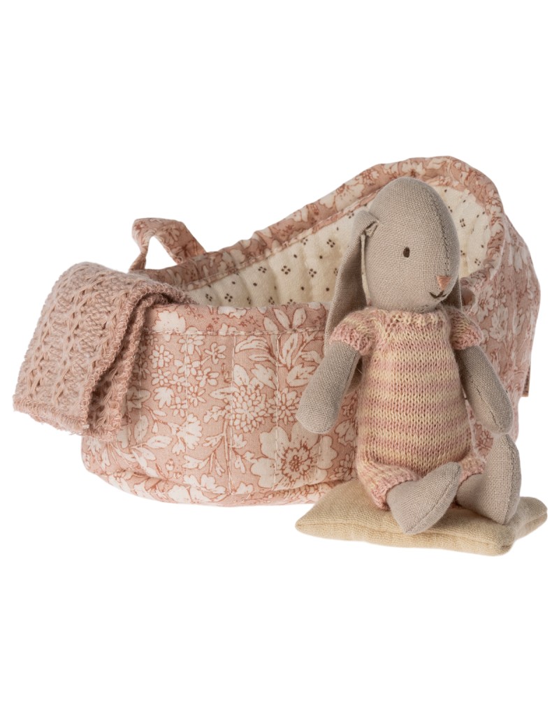 Este juego es el comienzo perfecto para cualquier historia. Un capazo suave confeccionado con una bonita tela donde el pequeño conejito con su colorido traje puede arroparse fácilmente para una siesta, cubierto con una manta de punto para mantenerse abrigado.