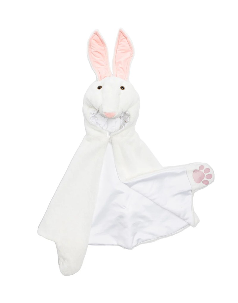 Esta capa está hecha de suave piel blanca, cuenta con una encantadora cabeza de conejo de peluche y orejas que se levantan.