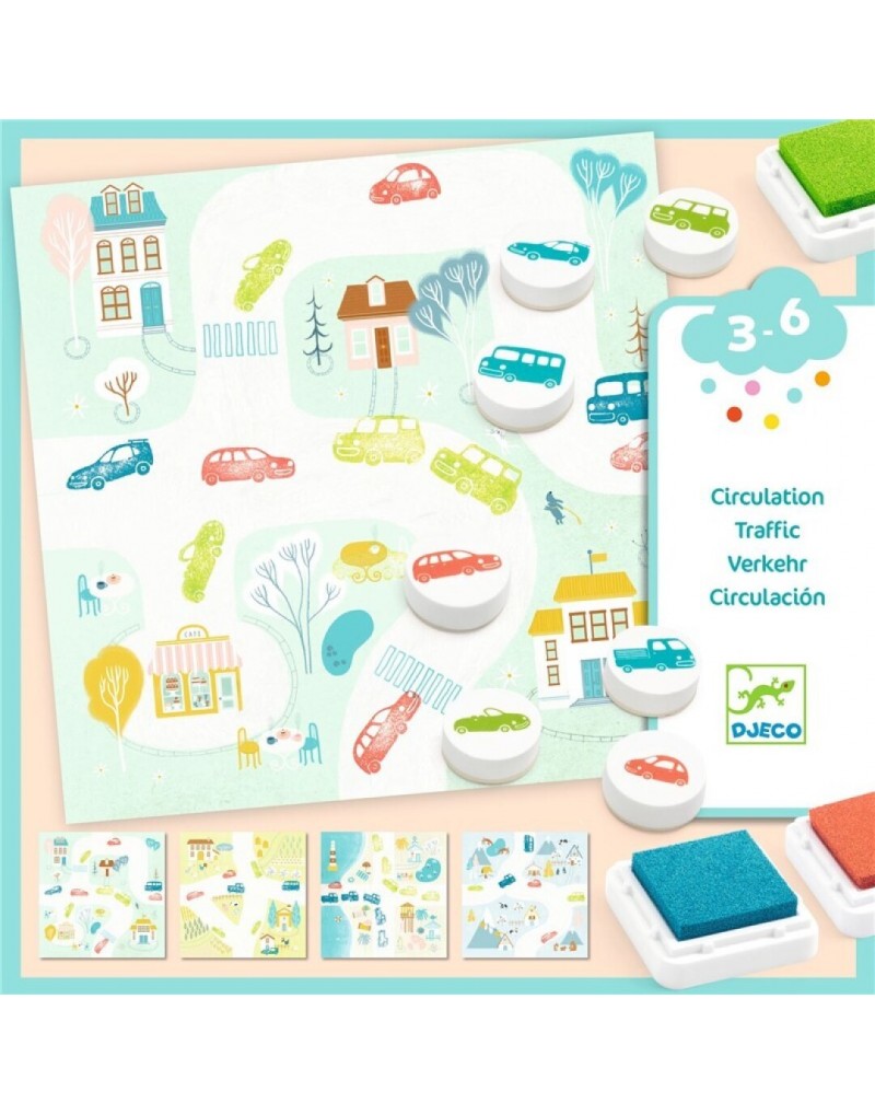 Una manualidad con 16 imágenes que pueden unirse, 7 sellos de coches para decorarlas y 3 grandes almohadillas de tinta para que las creaciones sean siempre distintas.