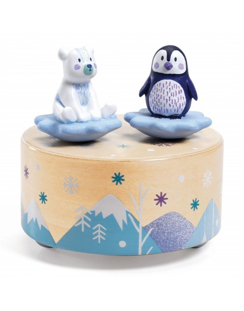 Una caja musical muy invernal con una figura de oso y de pingüino, que al darle cuerda empiezan a girar y bailar al compás de la melodía de la Sinfonía de los juguetes de Mozart. La música dura aproximadamente 2 minutos y medio.