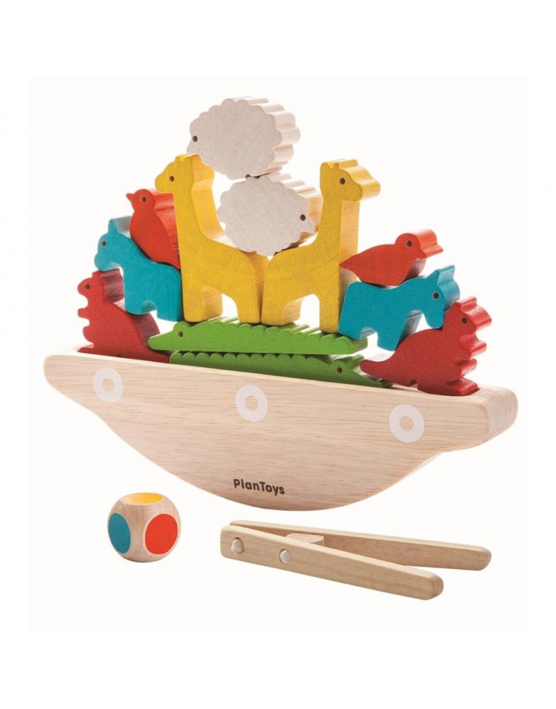 Lanza los dados para ver qué color obtienes, luego elige un animal que tenga el mismo color que sacaste. El jugador que puede equilibrar los animales en el barco usando las pinzas sin hacer que se caiga es el ganador. El conjunto consiste en un barco, 6 pares de animales, un dado y unas pinzas. De 1 a 4 jugadores. Ayuda a desarrollar habilidades motoras finas.