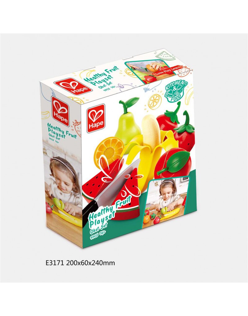 Acostúmbrate a comer de forma saludable con este bonito set de frutas. Incluye un cuchillo de juguete realista, dos fresas, una pera, una naranja, una manzana, con tallos estraíbles y una rodaja de sandía, que los peques pueden cortar con el cuchillo de juguete, además de un plátano que se puede pelar.