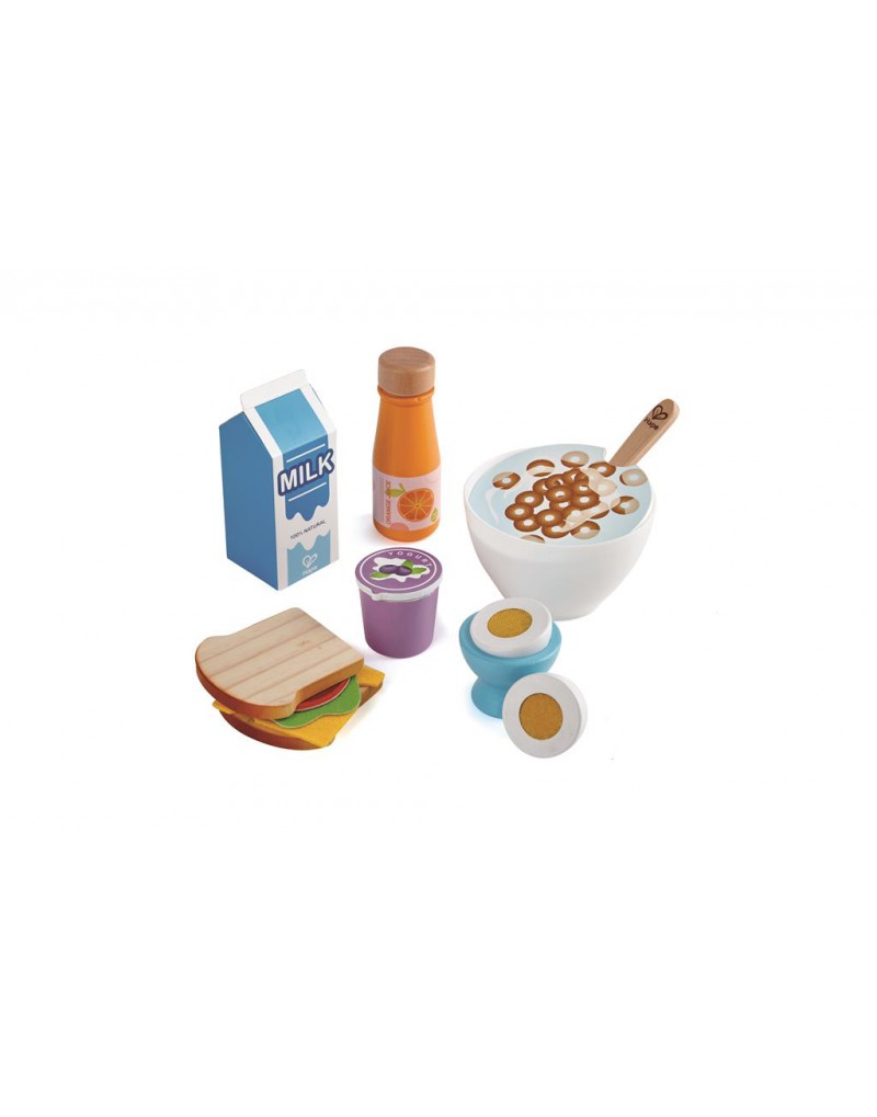 Prepárate para la comida más importante del día con este juego de desayuno. Incluye yogur con tapa que se puede abrir, leche y una botella de zumo de naranja que hace clic cuando giras la tapa. También incluye un huevo y una huevera, un tazón de cereales con una cuchara, dos rebanadas de pan y una rodaja de tomatem lechuga y queso.