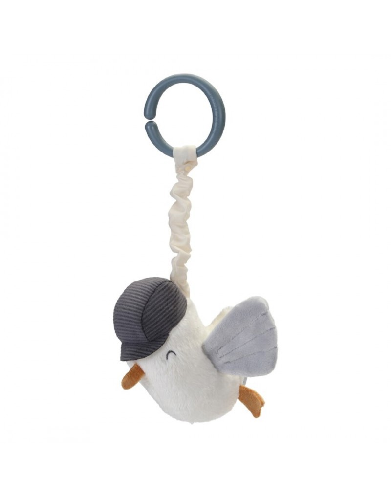 Gaviota de color blanco roto con las alas azul cielo y un bonito sombrero azul marino. ¡Tira de la gaviota para que vibre! Tiene una anilla para colgarla de donde más te apetezca.