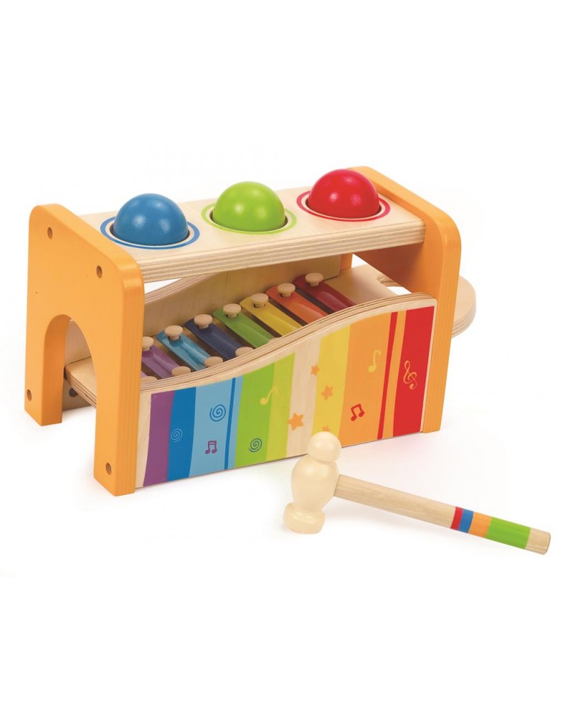 El juego de coordinación consiste en tres bolas de diferentes colores, que se asocian con los colores que circulan los agujeros donde las tienen que posicionar antes de martillear, lo que fomenta el desarrollo de la motricidad fina y coordinación ojo-mano. El xilófono es extraíble.