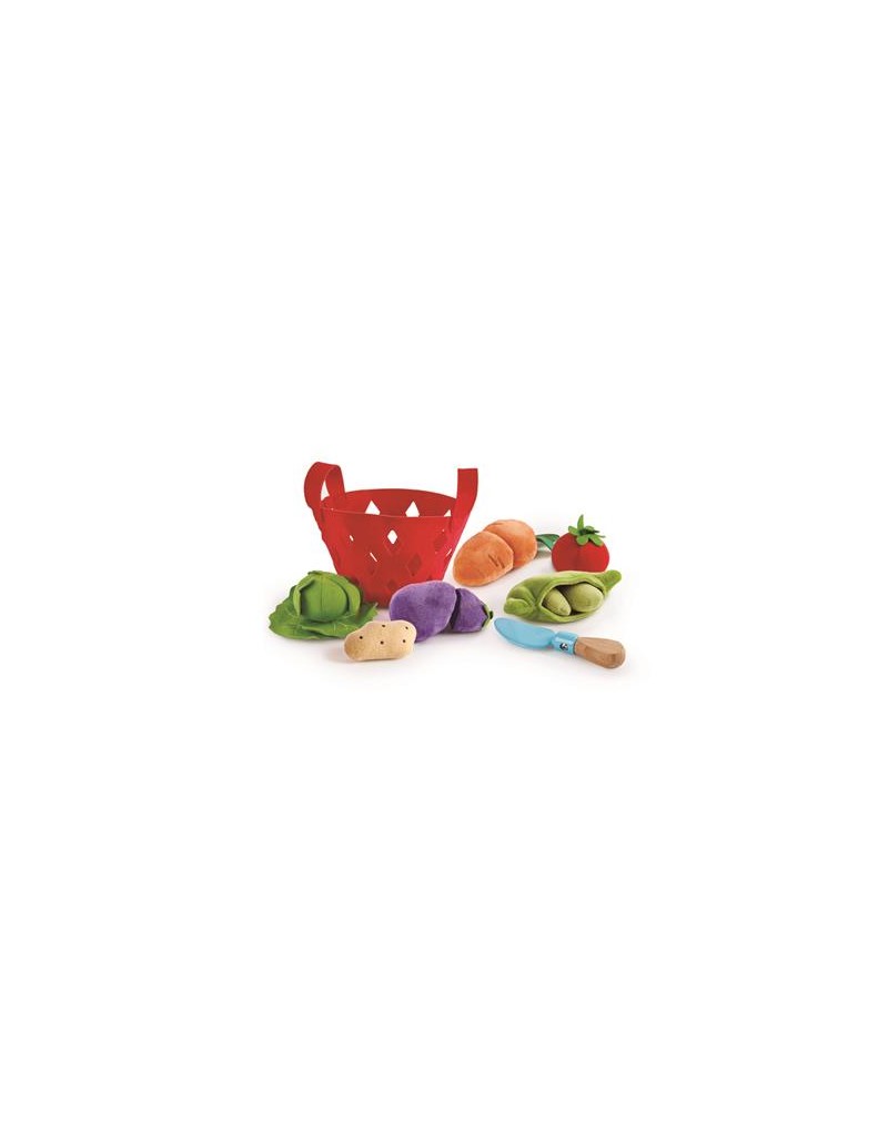 La cesta de fieltro es suave y segura para los bebés. Cuchillo seguro con mango de madera grueso, ideal para que lo agarren los dedos pequeños Incluye seis verduras. La zanahoria y la berenjena se pueden cortar por la mitad; vuelva a unir con velcro. El repollo tiene tres hojas removibles. La vaina de frijol corredor contiene dos frijoles. Lavable en la lavadora.