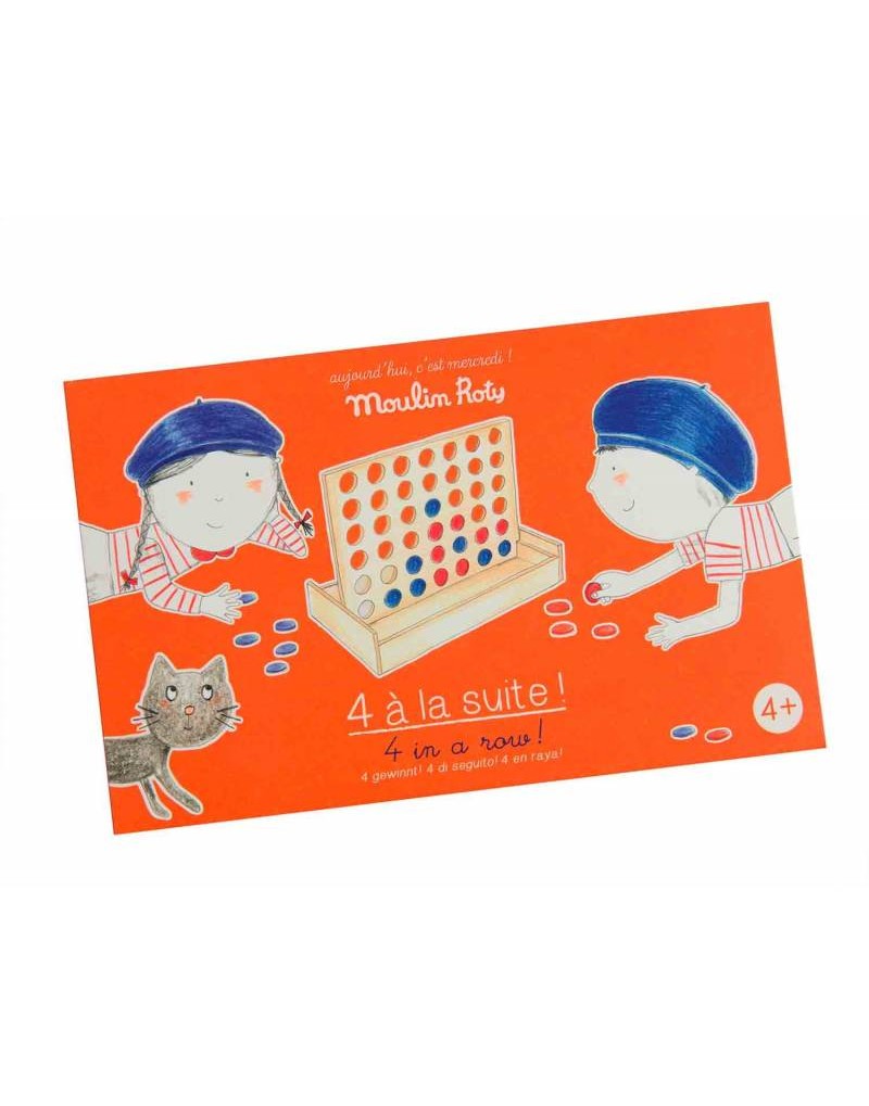 Juego 4 en Raya Mercredi de Moulin Roty. Este juego Moulin Roty 4 en raya tiene un tablero de juego de madera fácil de instalar y 42 fichas para jugar en el auto o en casa. El primer jugador en alinear 4 peones del mismo color gana el juego.