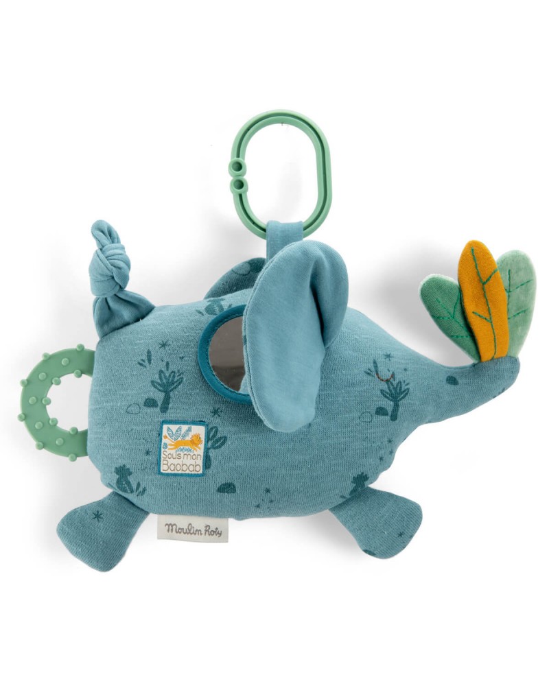 Un cascabel en la barriga del elefante, un espejo bien escondido, 3 dulces hojas en la trompa de Bergamota y un anillo mordedor para aliviar las encías doloridas de tu bebé. Muy suave y de color azul cálido, este juguete estimulará los sentidos de la vista, el tacto y el oído de tu bebé. Contiene un accesorio ideal para colgar de la cuna, parque, carrito...