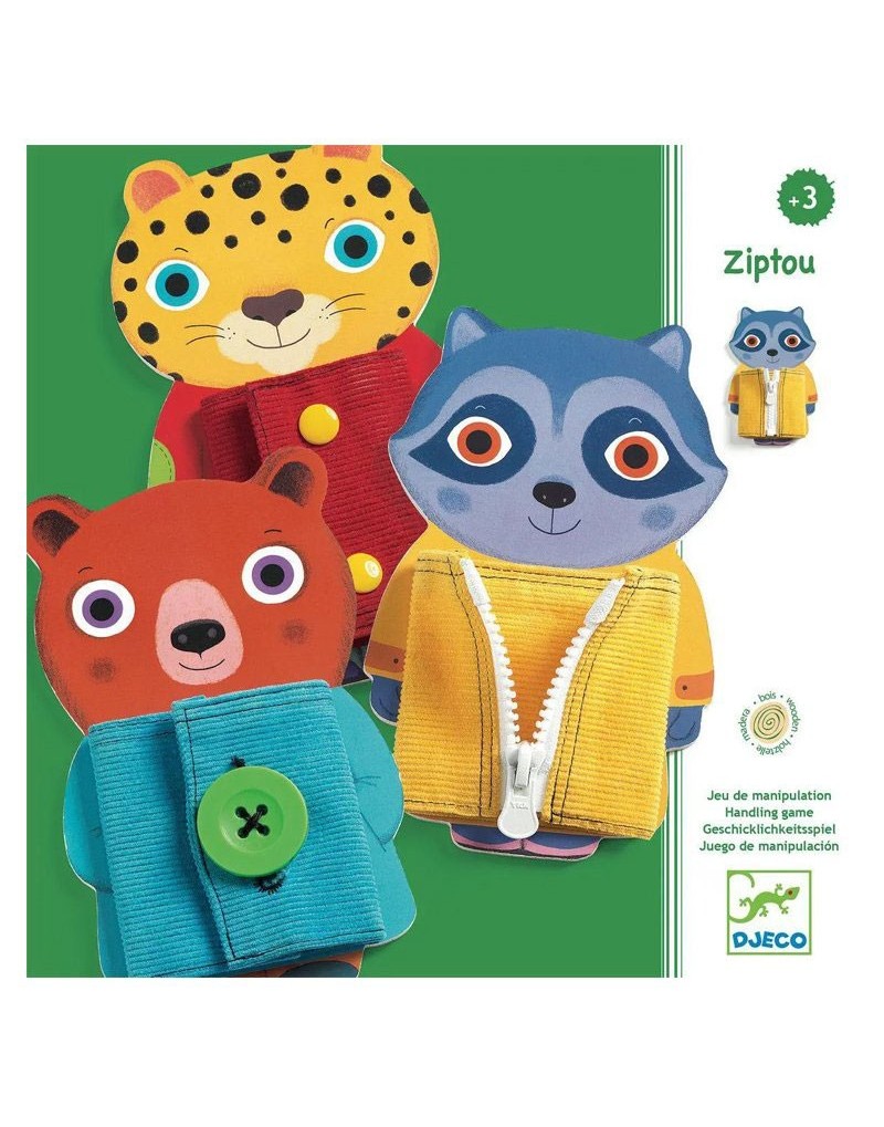 Ziptou son tres simpáticos animalitos de madera con los que jugar y aprender a abrochar. Subir y bajar cremalleras, abotonar y desabotonar con ojal y con clic. Fomenta la motricidad fina.
