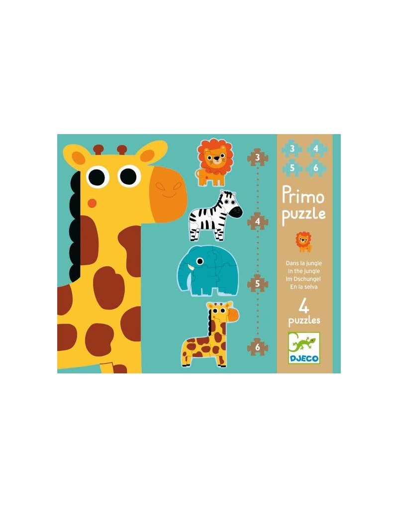 Estuche que contiene 4 puzles evolutivos de siluetas de dificultad creciente sobre el tema de los animales de la selva. Un león de 3 piezas, una cebra de 4 piezas, un elefante de 5 piezas y una jirafa de 6 piezas.