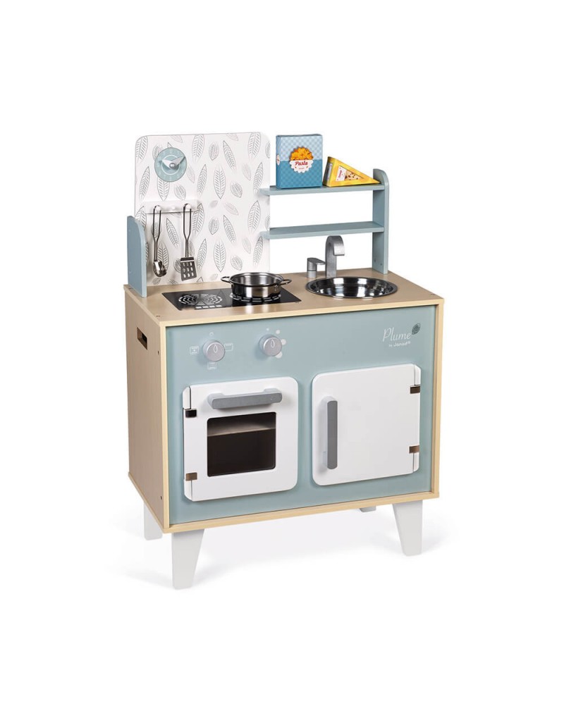 ¡Rápido, la cocina echa humo! ¡Hay que preparar la mejor comida para mamá y papá! Con la preciosa cocina Plume, hacer los platos más deliciosos es una auténtica delicia para los peques. Para convertirse en un gran chef, esta cocina de madera natural y tonos grises y azules tiene un montón de accesorios.