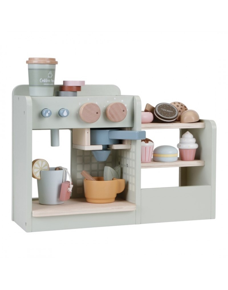 ¿Café o té? ¿Te gustaría una galleta o un pastel para llevar? Con este adorable set de madera tendrás instantáneamente un escenario de juego de un hogar o una tienda. Conviértete en un experto cafetero y prepara una buena taza de capuchino con tu propia máquina o sirve las mesas de tu pequeña cafetería con el menú repleto de delicias.