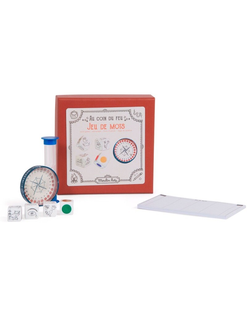 Incluye: 1 reloj de arena, 4 cubos temáticos, 1 bloc de notas con plantilla y una brújula/ruleta para seleccionar una letra al azar.