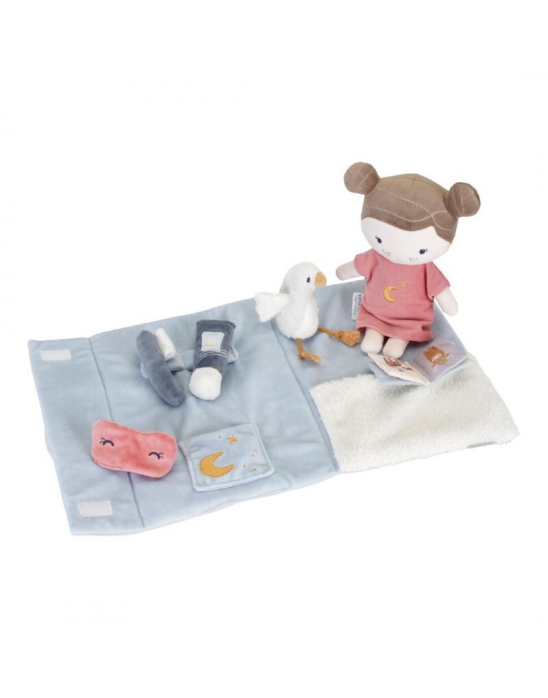 Es hora de dormir! Mira a Rosa en su lindo pijama, simplemente no puede esperar para dormir juntos. Ha empacado su maleta con todos los elementos esenciales para pasar la noche. La suave maleta azul claro se pliega para convertirse en una cama y lleva los accesorios para dormir más encantadores para imitar el ritual de la hora de acostarse.