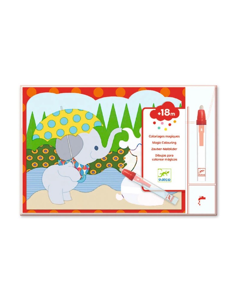 Un pack de acuarelas adecuado para niños a partir de 18 meses. El niño colorea las partes blancas con el lápiz de agua para descubrir lo que se esconde en el cielo. Es mágico: los dibujos aparecen y cambian de color. Las tablas se secan y el niño vuelve a empezar. ¡Efecto mágico! Un lápiz grande adecuado para manos pequeñas.