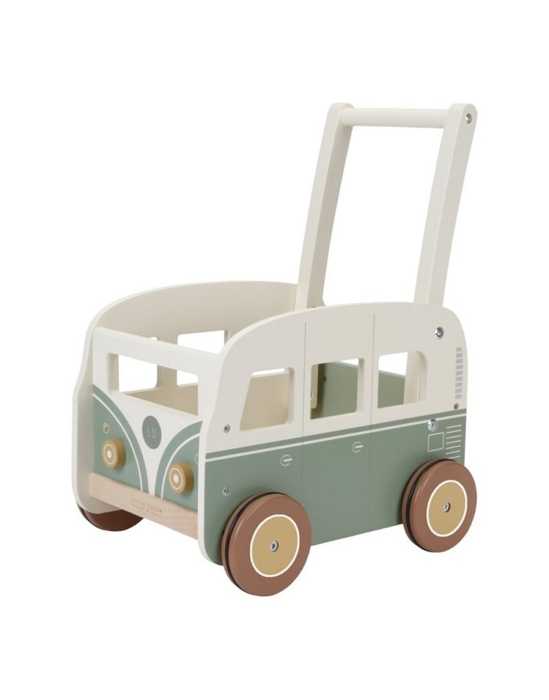 El carro andador Vintage de madera con su diseño atemporal de una furgoneta surfera vintage es también la caja de juguete perfecta para tu bebé.