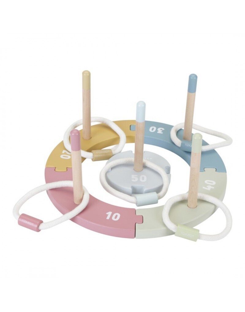 ¡Enfoca, apunta y lanza! Intenta pasar tu anillo de cuerda alrededor de los postes de madera y gana puntos. Prueba los diferentes campos de juego. ¡Una actividad divertida para toda la familia! Jugar a este clásico juego de lanzamiento de aros desarrollará la coordinación mano-ojo de tu pequeño, la estimación de distancias y la puntería precisa.