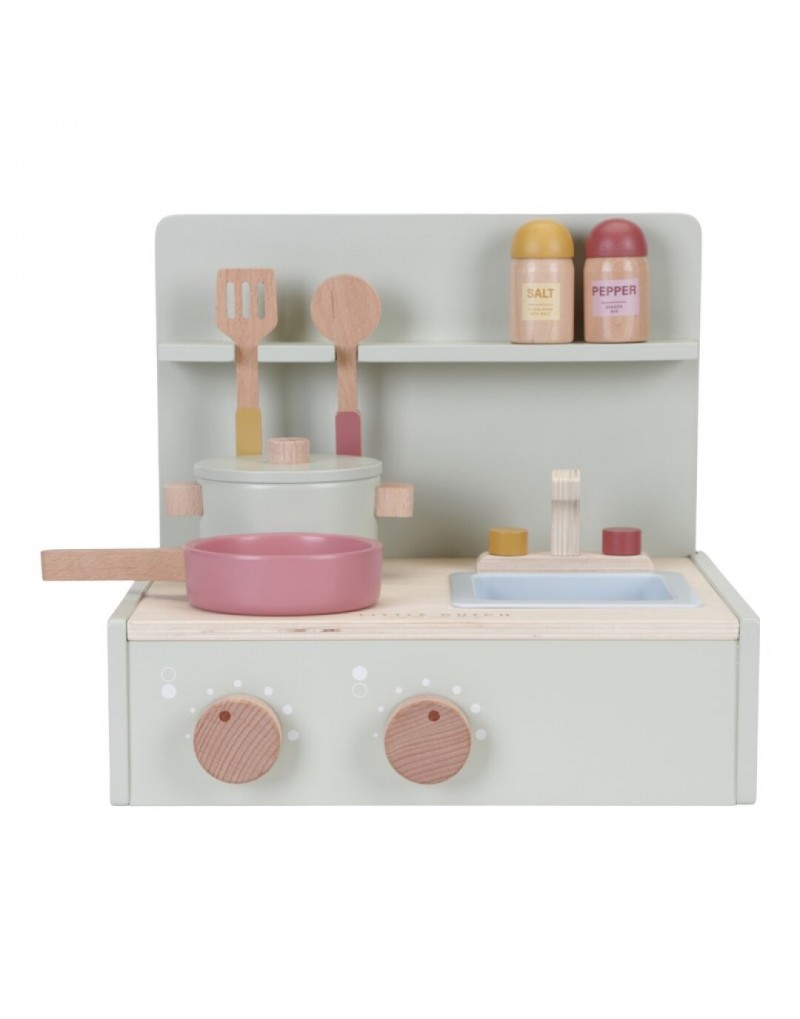 ¡Con esta mini cocina de madera, puedes convertir cualquier superficie plana en una zona de cocina! Hay una cacerola y una sartén para preparar los más sabrosos menús. Incluso hay un pequeño fregadero, dos espátulas y lo esencial para cualquier comida: salero y pimentero. Esta linda y pequeña cocina es plegable para transportarla fácilmente y para empacar todos los accesorios en su interior.