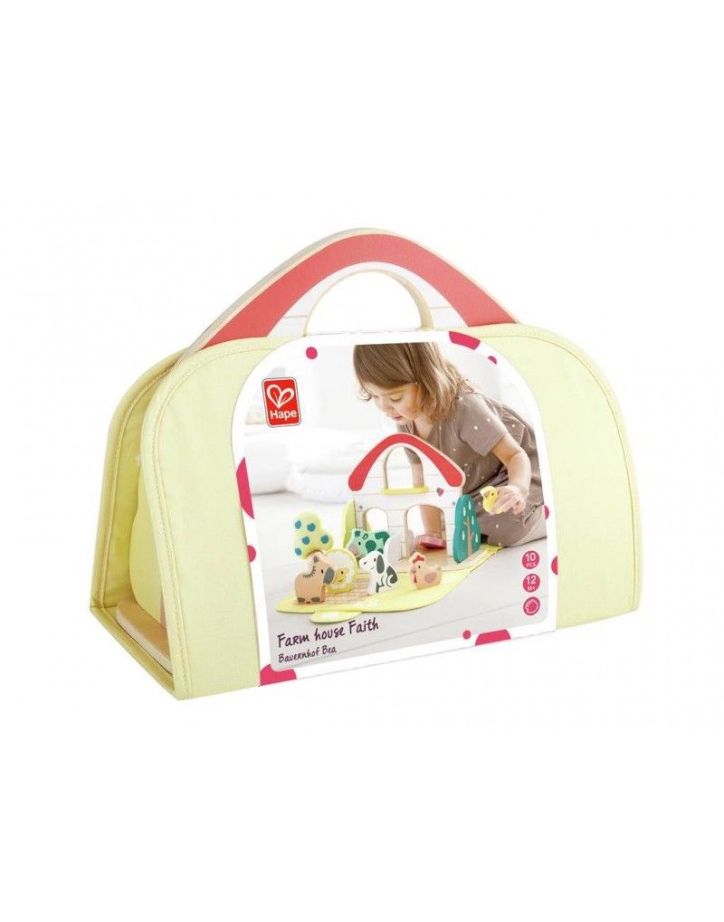 Esta granja es una colorida granja de madera para los más pequeños. Está construida sobre una práctica alfombra de juego textil. El juego portátil consta de ocho animales de granja y accesorios de madera y tela. Gracias al asa de transporte de madera integrada, se puede llevar fácilmente a cualquier parte.