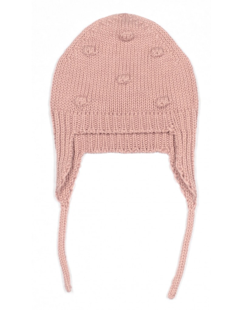 Gorrito de bebé Li&Me de color rosa palo con bolitas en la parte delantera y trasera. Tiene un cordón en cada lateral para poder ajustarlo. Tejido: algodón