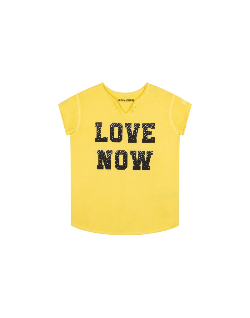 Camiseta niña Zadig & Voltaire de manga corta de color amarillo con las letras "love now" de color negro en la parte central delantera. Tejido: algodón.