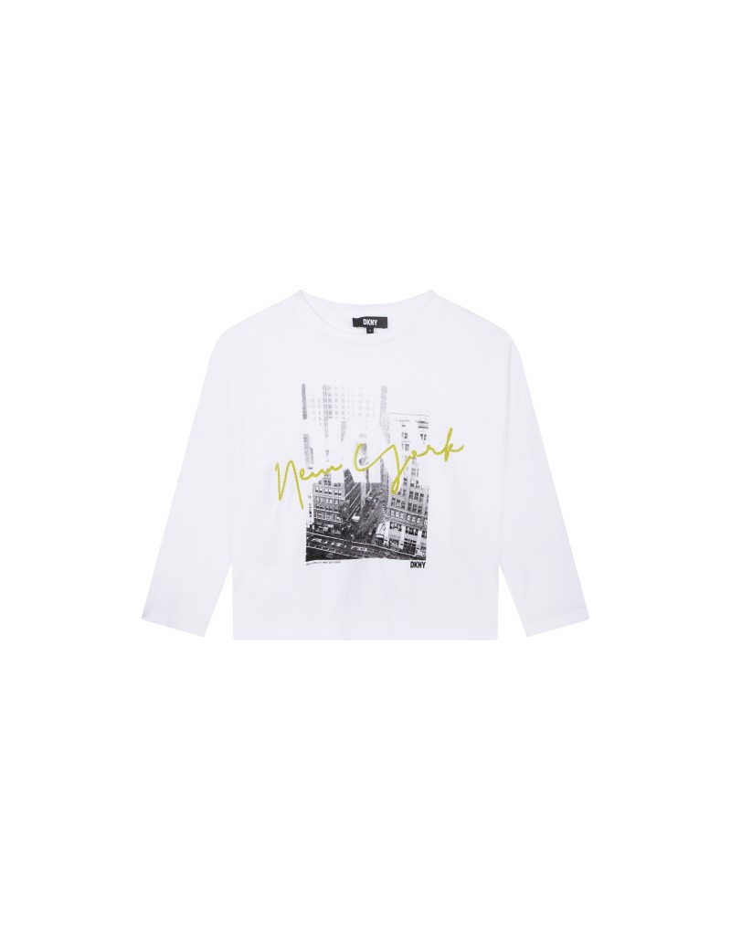 Camiseta de niña DKNY de manga larga de color blanco con el estampado de una ciudad y las letras "New York" de color amarillo en la parte central delantera. Tejido: algodón.