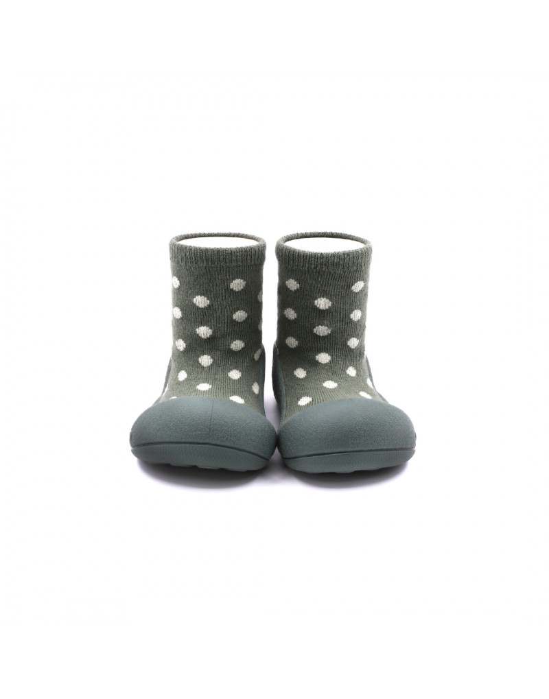 Calzado Attipas para bebé con la suela de color kaki y el calcetín kaki con topos blancos. Tejido: algodón, elastane, hilo de caucho, hilo de poliuretano.