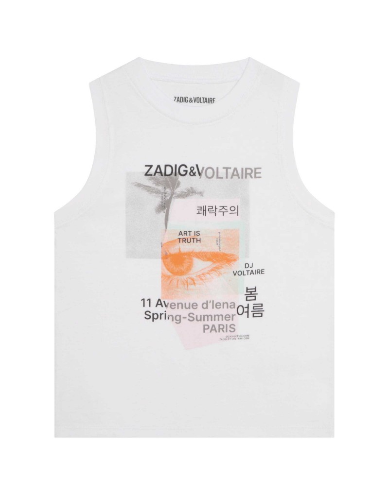 Camiseta niña Zadig & Voltaire sin mangas de color blanco con la frase "art is truth" con el dibujo de un ojo naranja y unas palmeras blanco y negro en la parte central delantera. Tejido: algodón.