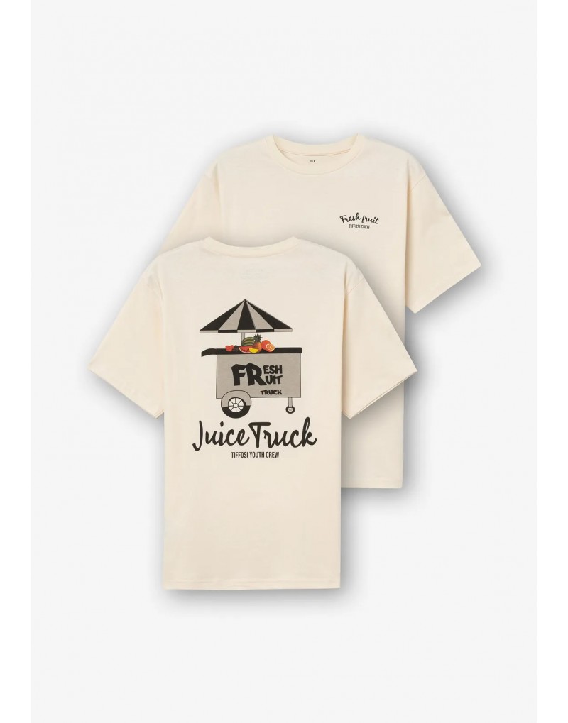 Camiseta con cuello redondo y manga corta. Estampado frontal con letras en negro en el lado izquierdo y estampado en espalda de "Juice Truck" en negro y beige y frutas de colores.