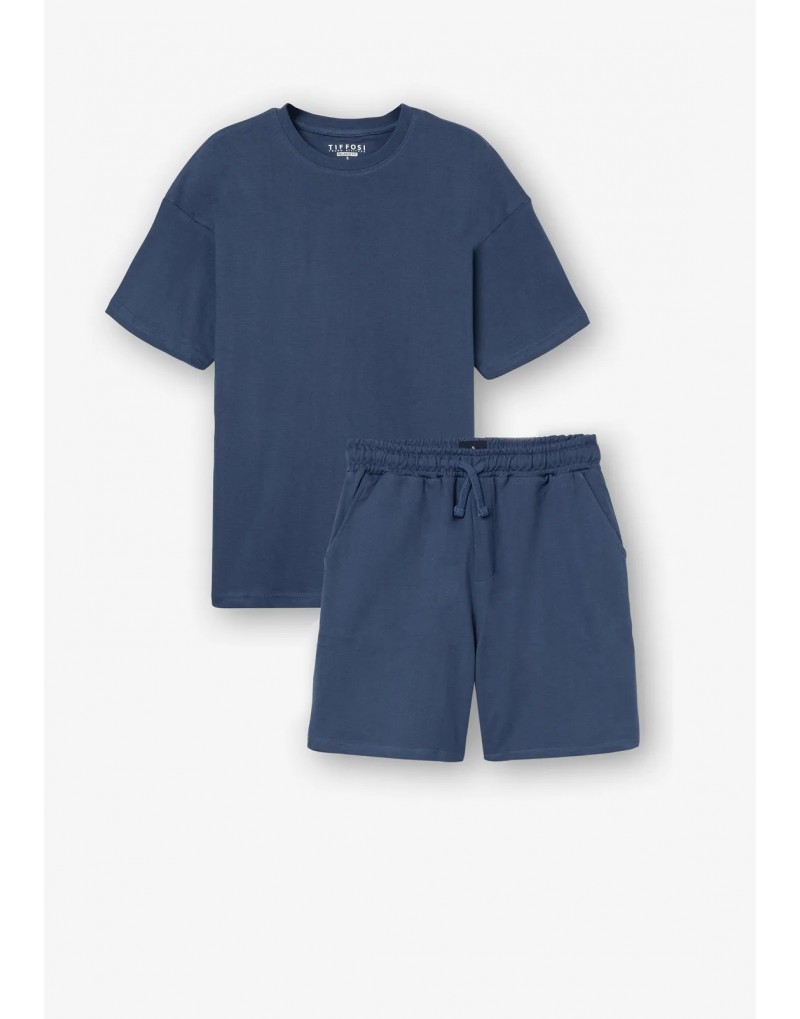 Pack en azul marino de camiseta con cuello redondo y manga corta y pantalón/bermuda en el mismo tono. El pantalón dispone de goma elástica y cuerda para adaptar el ancho y bolsillos en los laterales.