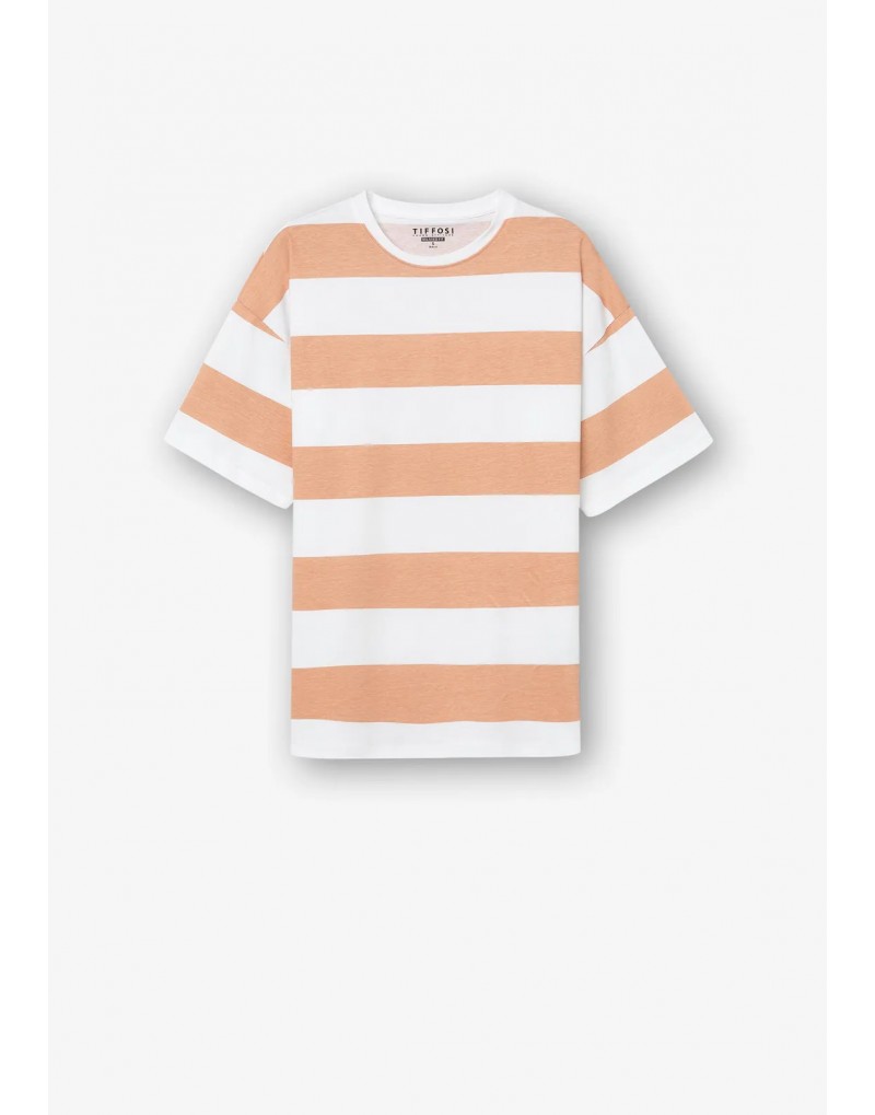 Camiseta con cuello redondo y manga corta. Estampado a rayas gruesas en naranja pastel y blanco.
