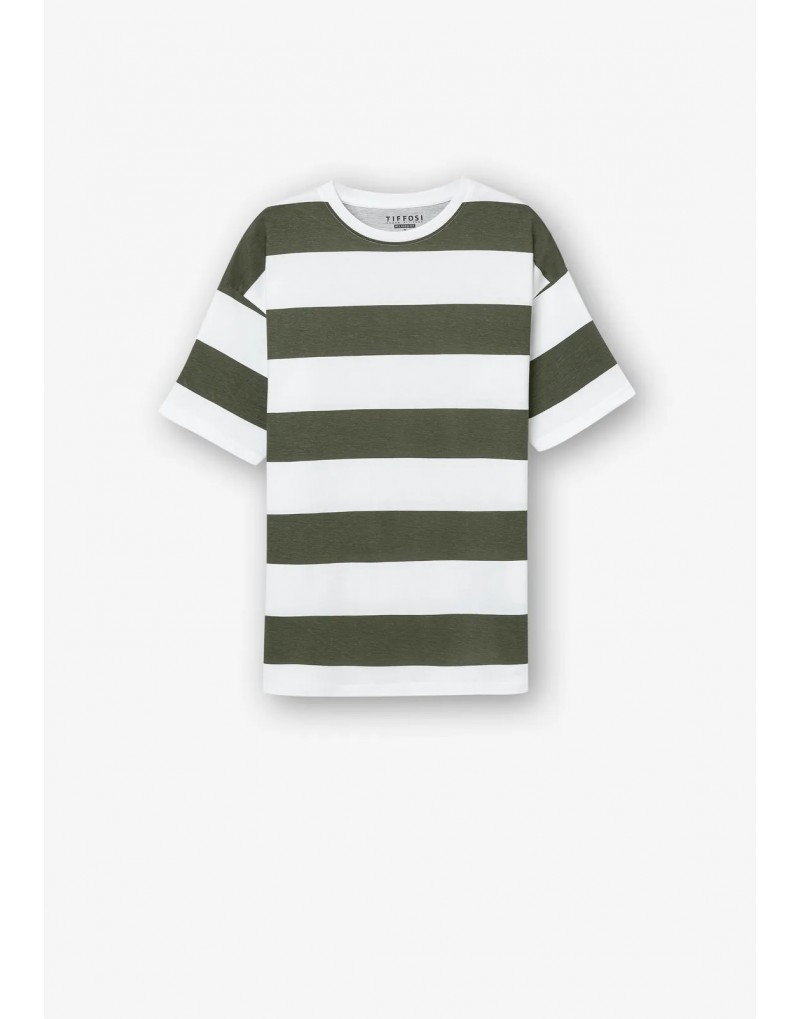 Camiseta con cuello redondo y manga corta. Estampado a rayas gruesas en verde y blanco.