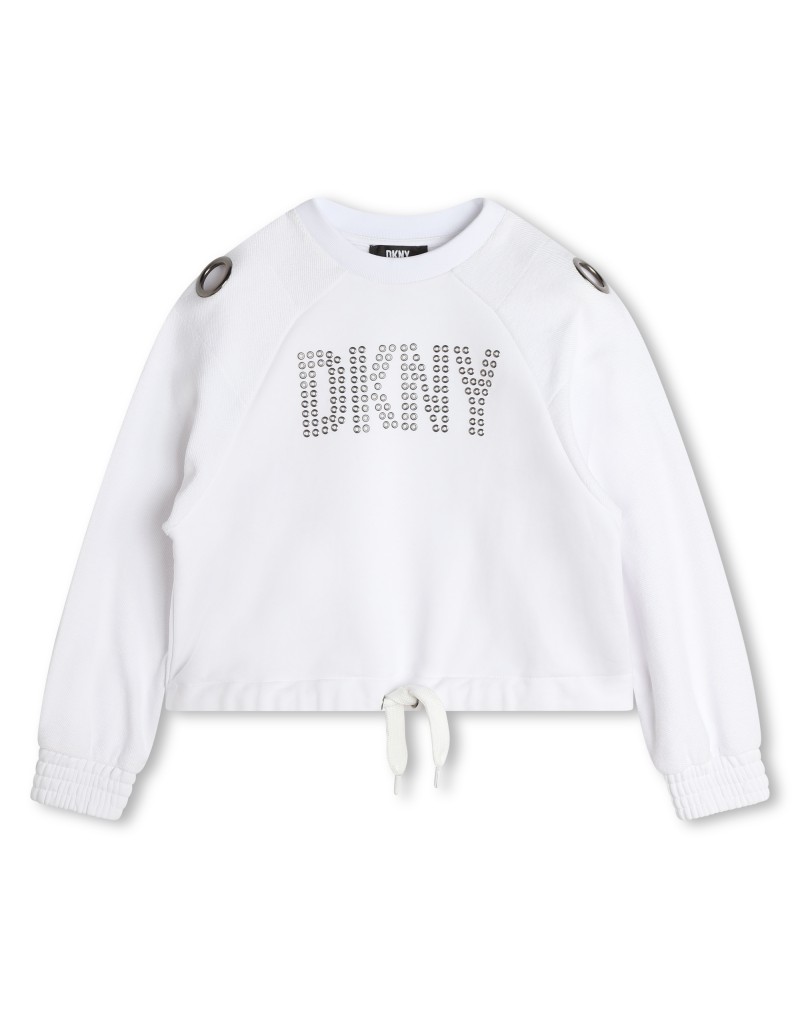 Sudadera niña DKNY de manga larga de color blanca. La sudadera, hecha 100% de algodón, dispone de dos anillas en los hombros y un diseño a base de tachuelas decorativas con el logo de DKNY como estampado en la parte frontal. La parte inferior de la sudadera se puede ajustar mediante un cordón.
