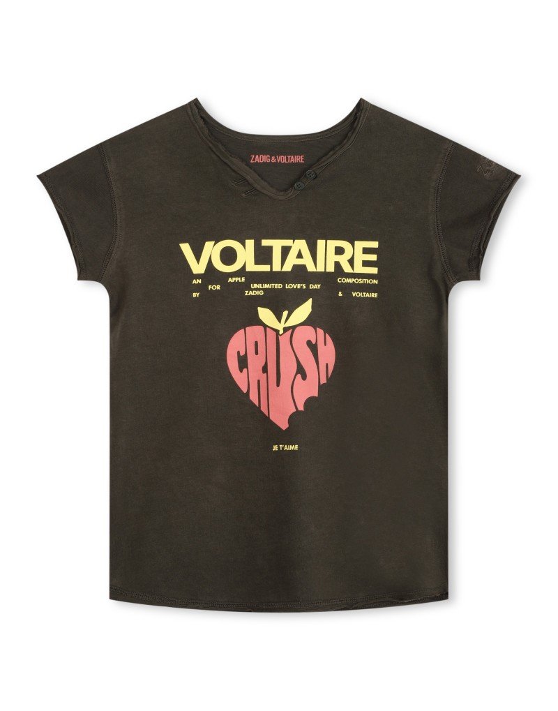 Camiseta de manga corta en forma de pico en color negro de Zadig & Voltaire. Hecha 100% de algodón orgánico, dispone de un estampado en la parte delantera de letras en tonos rosa (formando una manzana con la palabra "Crush") y amarilo. En la parte trasera hay un estampado de letras en amarillo.