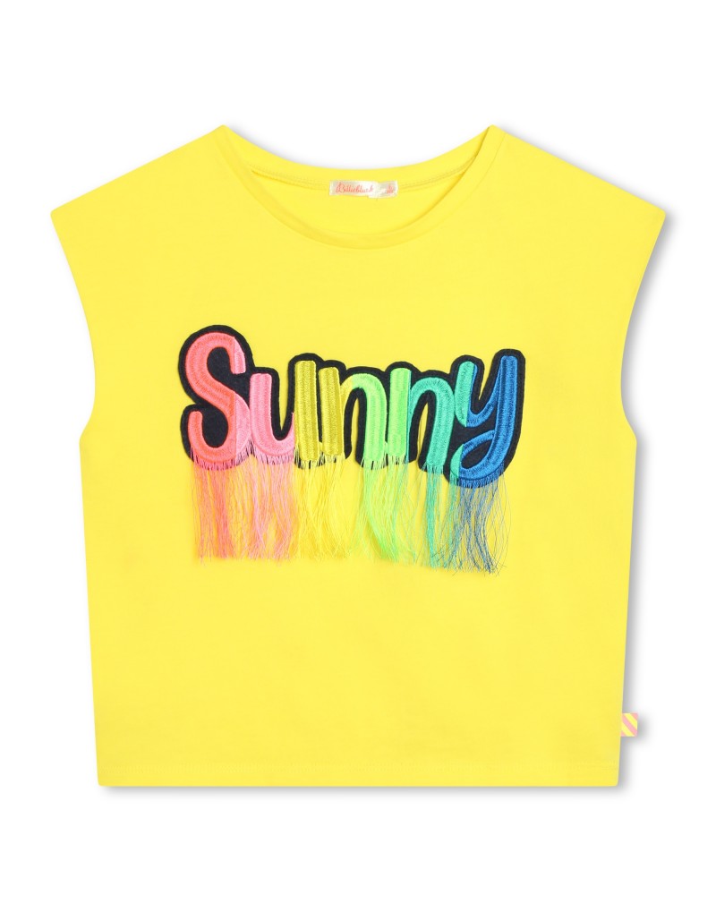 Camiseta de manga corta de Billieblush en amarillo. Con un corte ancho y moderno, se va a convertir en la camiseta ideal para cualquier ocasión desprendiendo luz y color. La camiseta, hecha 100% de algodón, tiene en la parte delantera un estampado en colores del arcoíris representando la palabra "Sunny" y con hilos de colores colgando de cada letra.
