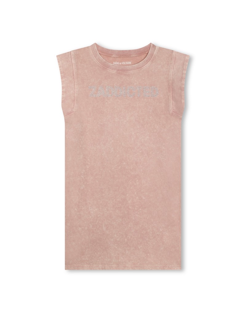 Vestido mii rosado de Zadig & Voltaire con estampado tie-dye nieve. El vestido, hecho 100% de algodón, dispone de un estampado en la parte superior delantera con la palabra "Zaddicted" en pedrería plateada.