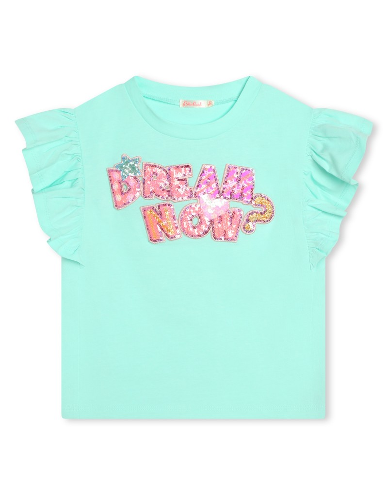 Camiseta de manga corta de Billieblush en azul. La camiseta tiene un corte ancho y moderno que la hace muy cómoda. Los volantes en la manga, además, le dan un toque romántico al modelo. La camiseta, hecha 100% de algodón, tiene en la parte delantera un estampado en lentejuelas rosas, amarillas y azules representando la frase "Dream now?".