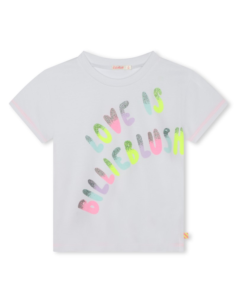 Camiseta de manga corta de Billieblush en blanco. La camiseta. hecha 100% de algodón orgánico, tiene en la parte delantera un estampado en letras de colores rosa, azul, lila y amarillo con la parte superior de purpurina de la frase "Love is Billieblush".