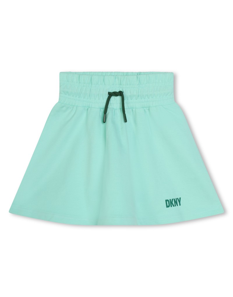 Esta falda corta de DKNY en turquesa es perfecta para combinar estilo y comodidad. Hecha 100% de algodón, la falda tiene un cordón de ajuste en la cintura para adaptarse perfectamente al cuerpo. Presenta un precioso corte acampanado y dispone, en la parte delantera,  de un estampado del logo de DKNY en un tono de contraste más oscuro en la parte inferior derecha.